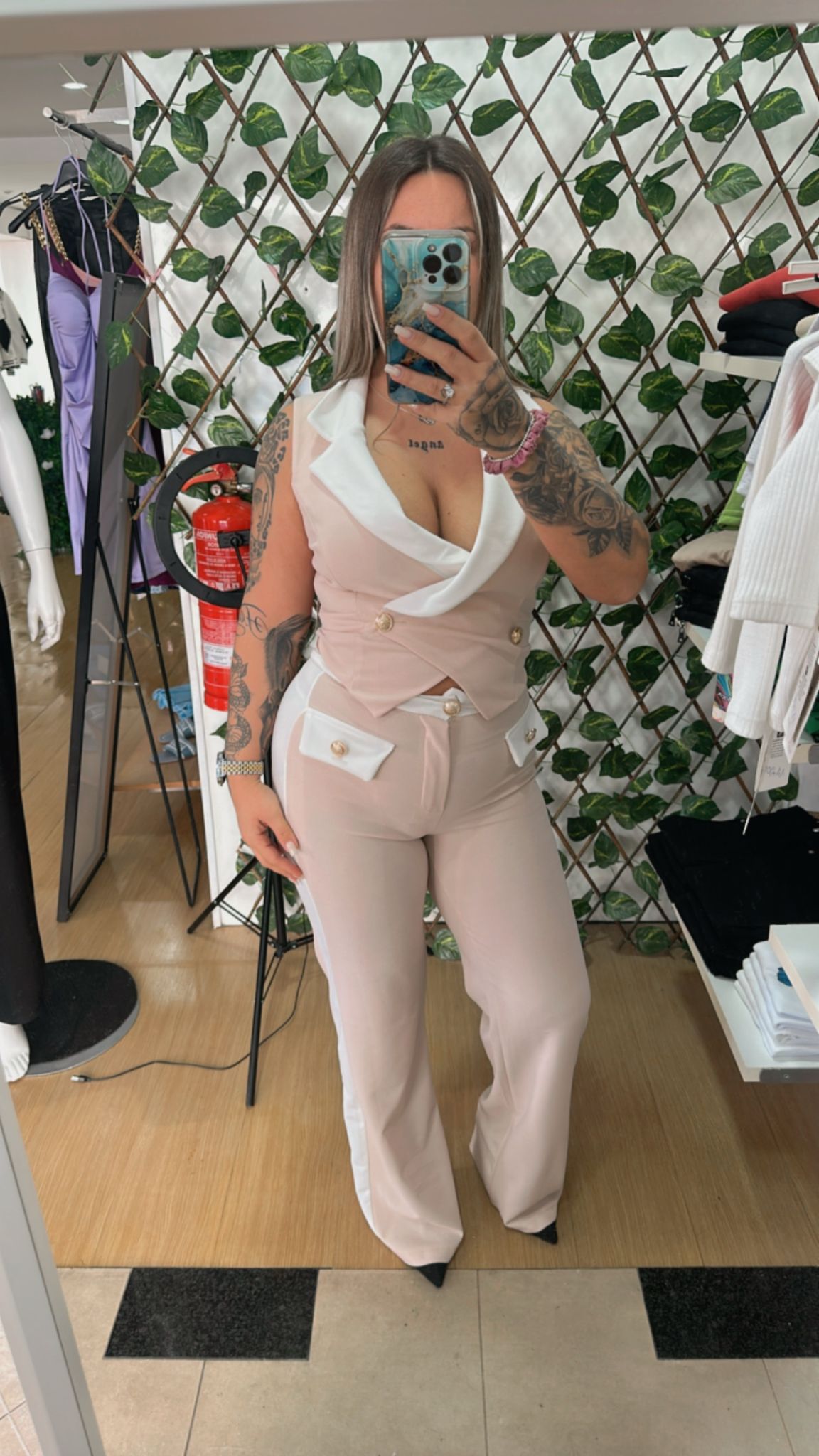 Um conjunto elegante composto por um colete sem mangas e calças combinando. O colete apresenta botões dourados e detalhes brancos nas lapelas, enquanto as calças possuem bolsos com acabamentos brancos e botões dourados que adicionam um toque sofisticado. Ideal para ocasiões formais ou para criar um visual moderno e refinado, este conjunto oferece estilo e conforto em perfeita harmonia.